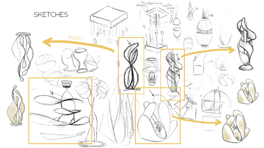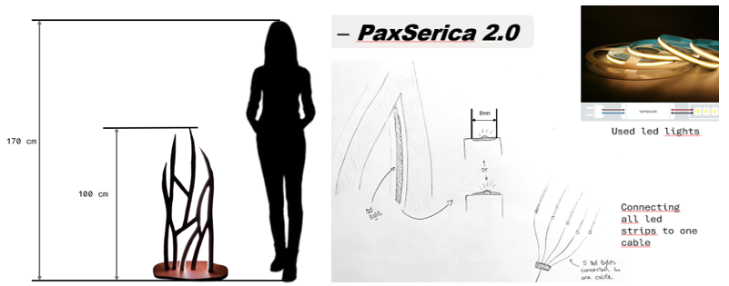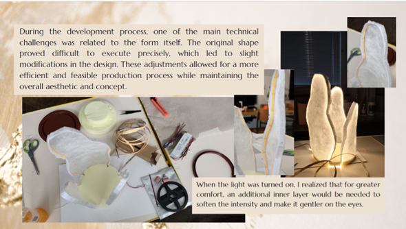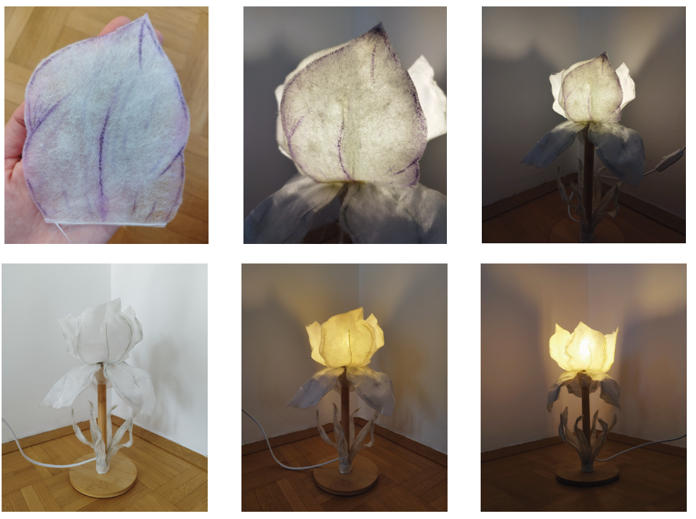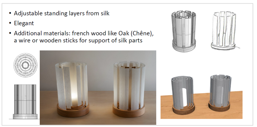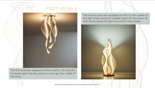 A series of original concepts was created, including: a clock-lamp featuring a Silk Road motif by Bennet Markovič; a partition lamp inspired by the wings of the silkworm moth by Amadeja Prijatelj; a table lamp incorporating elements of a flame motif by Ana Maria Varga; a bedside lamp with adjustable layered panels by Anja Kozjan and a lamp inspired by the physalis flower by Salomé Alexandra Ramalho Mateus, whose outer surface evokes the fragility of non-woven silk.