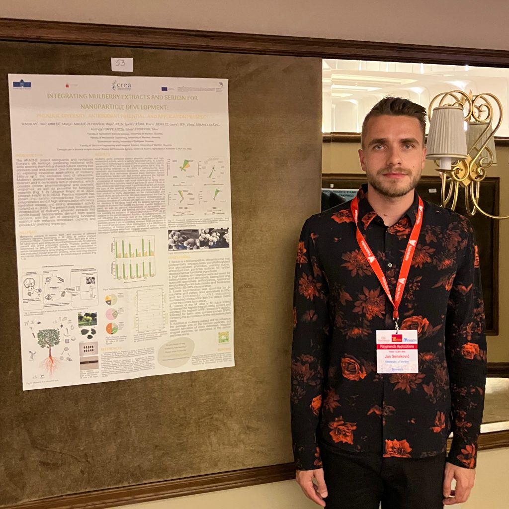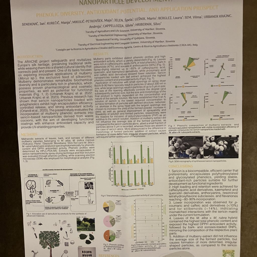 The novel research on mulberry- and silk-based materials was presented as a poster by Jan Senekovič, titled “Integrating mulberry extracts and sericin for nanoparticles development: phenolic diversity, antioxidant potential and application prospect,” during the Friday session of the conference chaired by Dr. Jan Frederik Stevens (University of Oregon, USA) and Dr. Andreas Schieber (University of Bonn, Germany).