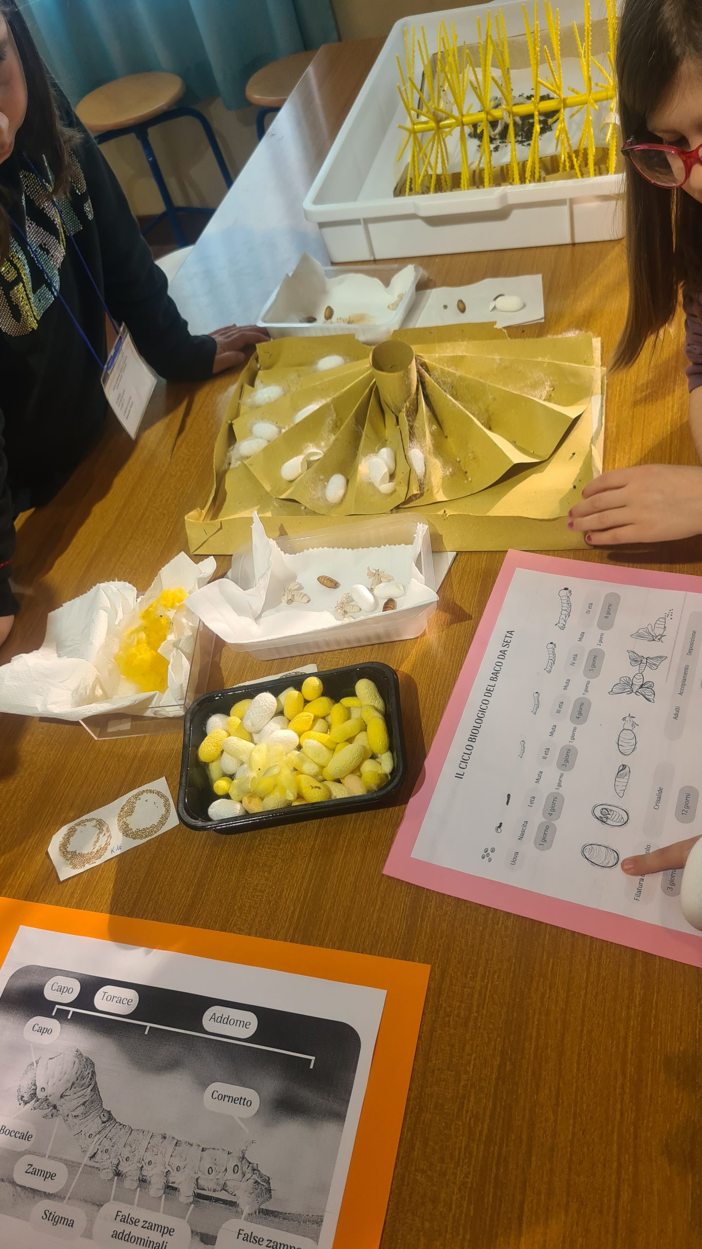 - observation of the silkworm in its different larval instar, from larvae to chrysalises and moths, with explanations of the life cycle and the characteristics of different strains;